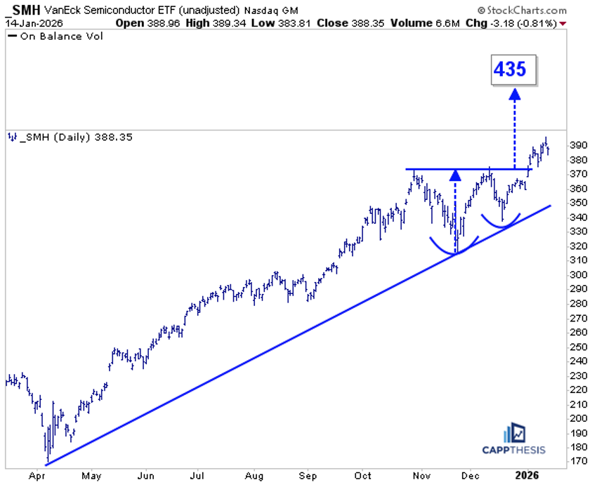 The VanEck Semiconductor ETF (SMH), on the other hand, continues to behave differently, and in a good way. As is clear on the chart, since breaking out in late December, SMH has yet to revisit its breakout zone, which sits near the 370 area. That level is important, as it represents the prior highs that repeatedly capped upside attempts in both October and early December. Taken together, that price action has formed a well-defined bullish Cup-With-Handle pattern. With the pattern fully activated, the resulting upside objective points toward the 435 area.